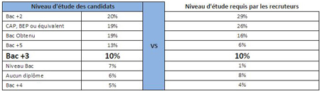 Entre les diplômes demandés par les recruteurs et ceux acquis par les candidats : rien ne va plus ! En effet, seuls les Bac+3, soit 10% des profils sont en adéquation entre l’offre et la demande. En revanche, les Bac+2 ne sont visiblement pas assez nombreux puisque 29% des recruteurs en recherchent et seulement 20% des candidats ont ce niveau d’étude. Même constat pour les CAP ou BEP qui représentent 19% des demandeurs d’emploi alors que les recruteurs en recherchent à plus de 26%.