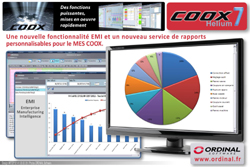 Avec la nouvelle fonctionnalité EMI, et ce, quelque soit le secteur d’activité, l’utilisateur de la suite logicielle MES COOX et de ses modules peut ainsi recueillir toutes les données de fabrication et les traiter sous la forme qu’il désire (graphiques, états statistiques, rapports, ...), que ce soit en matière de supervision, de suivi de production, de traçabilité, ou d’analyse de performance.