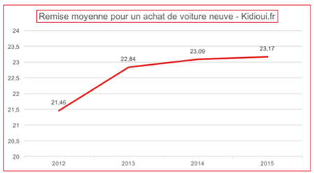 Après avoir pris 1,1 points en 2014, la remise moyenne a légèrement poursuivi son ascension en augmentant de 0,3 points sur 2015, pour atteindre les 23,17%. Contrairement au prix moyen, l’effervescence de nouveautés et l’essor des SUV ne semblent pas avoir eu de conséquences. Les affaires réalisées par les acheteurs en 2015 ont encore une fois été excellentes ! En effet, pour amortir des modèles tout juste commercialisés avec peu ou pas de remise, il a fallu d’autres modèles très bien remisés.
