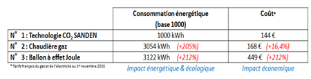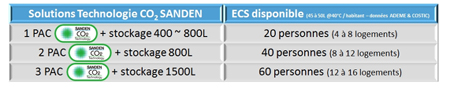 Retour d’expérience Afin d’assurer un confort sans faille sans pour autant surdimensionner les équipements de confort thermique, la Technologie CO2 SANDEN présente des avantages certains, le principal étant son mode de chauffage direct de l’eau (par refroidisseur de gaz dans la pompe à chaleur et non par échangeur autour ou dans le ballon de stockage). Cela a abouti à l’observation des résultats suivants :