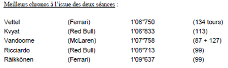 Au volant de la McLaren, Stoffel Vandoorne fut le seul pilote à être mis à contribution pendant les deux jours. Ferrari fit pour sa part rouler Kimi Räikkönen le lundi, avant que Sebastian Vettel ne prenne le relais hier, tandis que Red Bull s’aligna sur le même schéma avec Daniel Ricciardo et Daniil Kvyat.