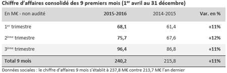 En séquentiel, le 3ème trimestre bénéficie des bonnes performances enregistrées durant la période des fêtes de fin d’année avec une progression de 27% par rapport au 2ème trimestre 2015/2016.