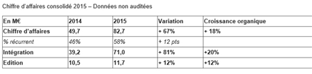 Les actions menées en 2015 pour développer et réengager la base clients se sont traduites par deux avancées majeures : 1/ Le Groupe a fortement élargi son portefeuille de clientèle et compte désormais 13 000 clients contre 9 500 en 2014 ; 2/ Le chiffre d’affaires récurrent (SaaS et maintenance) se monte à 48,1 M€ en 2015, approchant ainsi le chiffre d’affaires réalisé en 2014 par l’ensemble du Groupe. La part du récurrent représente désormais 58% du chiffre d’affaires contre 46% l’an dernier, renforçant encore la solidité du Groupe.