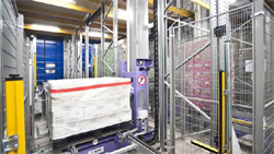 Le système de transport interne de la marchandise est réalisé au travers d’un système dénommé AGV (Automated Guide Vehicle). Il s’agit d’un véhicule guidé par laser qui permet le transport vers un grand nombre d’adresses et d’emplacements de stockage dans le magasin. De plus, la communication et l’échange des données sont réalisés au travers d’un réseau sans fil (WIFI), favorisant un contrôle exigeant de la traçabilité de la marchandise.