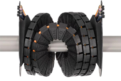 En terme de durée de vie aussi, les tests dans le laboratoire igus ont apporté la preuve du niveau de performance de l’e-spool. Cette variante spéciale isolée a aussi été testée en terme de tenue de durée de vie escomptée par un client. Un résultat également convaincant : Déroulé sur l’ensemble de ses douze mètres avec le ressort de rappel intégré maintenant en permanence la traction requise pour la chaîne déroulable, et avec la rotation maximale de la twisterband d’igus utilisée, l’e-spool a dépassé largement les 24.000 allersretours requis, sans connaître le moindre problème. Dans ce système, la twisterband sert de maillon au travers duquel les câbles sont guidés sans interruption jusqu’à la chaîne enroulée et permet la rotation de l’enrouleur. igus propose des e-spool avec une ou deux twisterband en fonction du nombre de câbles devant être guidés. La durée de vie possible est fonction de l’application et de la variante et peut dépasser le million de mouvements.