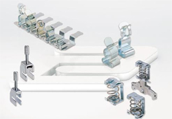 Cette gamme comprend différentes séries : les connexions se font : soit avec un système de serrage à ressort, soit avec un système de serrage par vis à tête moletée , soit avec des systèmes d’installation pour une fixation directe , sur jeux de barres, sur rail de fixation ou sur rail de profil C. Des supports de maintien sur rail et des butées d´arrêts pour le montage de jeux de barres complètent l’offre produit. Ces composants ont les mêmes dimensions que les borniers à vis de séries SRK/SSL et RK/SL pour les sections jusqu’à 10 mm². Ils fournissent un ajustement serré par friction sur différents types de rails de fixation. Pour le positionnement libre des reprises de blindage sur des platines de montages ou dans des armoires, des supports de rail sont disponibles. Des jeux de barres 10 x 3 peuvent être installé facilement et rapidement. Avec ces lignes de produits complètes et complémentaires, la gamme de systèmes de blindage de CONTA-CLIP est l’une des plus complètes du marché, et offre simplicité et flexibilité.