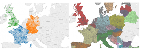 A gauche 9.2 : Points uniquement au Royaume-Uni, en France et en Allemagne. A droite 9. 3 : Points et polygones pour chaque pays supporté par 9.3 incluant dorénavant : l’Albanie, Andorre, l‘Autriche, la Belgique, la Biélorussie, la Bosnie-Herzégovine, la Bulgarie, Chypre, la Croatie, le Danemark, l’Espagne, l’Estonie, la Finlande, l’Ancienne République yougoslave de Macédoine, Gibraltar, la Grèce, la Hongrie, l’Islande, l’Italie, la Lettonie, le Liechtenstein, la Lituanie, le Luxembourg, Malte, Monaco, le Monténégro, la Norvège, les Pays-Bas, la Pologne, Saint-Marin, la Serbie, la Slovaquie, la Slovénie, la Suède, la Suisse, la République tchèque, la Turquie et la cité du Vatican.
