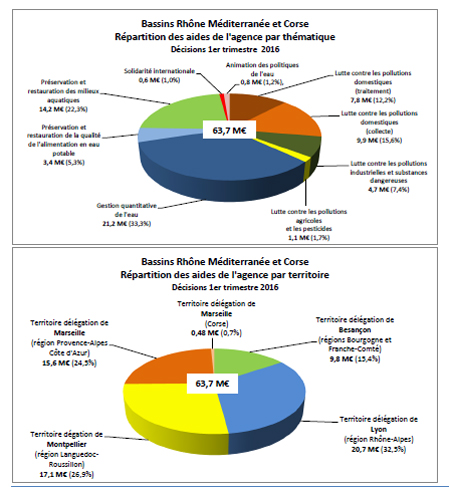 La Communauté d’Agglomération du Bassin de Thau (34) installe un bassin de stockage des eaux de pluie à Marseillan Ville afin de protéger la qualité des eaux de la lagune de Thau, l’activité conchylicole et la baignade. L’aide de l’agence est de 1,6 M€. La commune d’Etalans (25) construit une nouvelle station d’épuration qui permettra de réduire fortement les rejets d’eaux usées à la Loue. L’agence de l’eau apporte une aide de 1,1 M€.