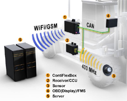 La nouvelle solution télématique ContiFlexBox permet aux gestionnaires de flotte, aux conducteurs et aux équipes de maintenance de connaître en permanence les informations sur les pneus et les véhicules. Sa combinaison avec le système de contrôle de pression des pneus testé et éprouvé, le ContiPressureCheck™, permet de gérer plus efficacement sa flotte de véhicules. Le système informe le conducteur lorsque la pression des pneus doit être corrigée. Les immobilisations de véhicules et le risque de dommage des pneus, les travaux d’entretien et le temps passé sont donc réduits. L’efficacité de la flotte est améliorée grâce à une diminution des coûts d’exploitation. La ContiFlexBox est installée dans la cabine du chauffeur et est alimentée par le système électrique du véhicule. Le système de contrôle de la pression ContiPressureCheck™ récupère automatiquement les données sur la pression et la température des pneus tubeless à l’aide de capteurs collés sur le calandrage intérieur. La ContiFlexBox peut être utilisée dans les véhicules de différents domaines industriels, même pour des utilisations hors route (OTR).