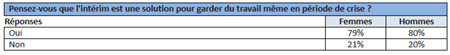 En période de crise économique comme celle que nous vivons actuellement, les Français pensent majoritairement que le travail intérimaire est une solution pour l’emploi. En effet, 79% des femmes et 80% des hommes déclarent que l’intérim permet d’avoir du travail.