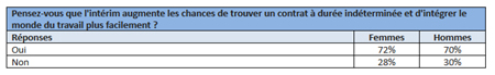 A la question " Pensez-vous que l’intérim augmente les chances de trouver un contrat à durée indéterminée et d’intégrer le monde du travail plus facilement ?", 72% des femmes et 70% des hommes répondent par l’affirmative.