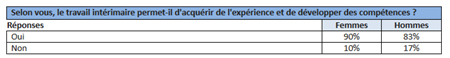 Pour ce qui est de l’acquisition d’expérience et du développement des compétences professionnelles, même constat. 90% des femmes et 83% des hommes pensent que le travail intérimaire permet largement de les développer et de les mettre en pratique.