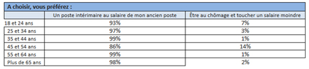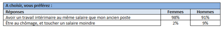 A choisir entre des indemnités de chômage ou un poste d’intérimaire, 98% des femmes et 91% des hommes préfèrent un travail en intérim contre 2% des femmes et 9% des hommes qui optent pour l’inactivité professionnelle.