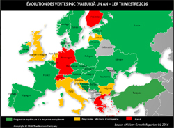 Au premier trimestre 2016, les ventes de PGC en Europe ont progressé de +0.8% en volume, la hausse des prix atteignant +0,7%, la plus faible progression constatée depuis le 1er trimestre 2010. En conséquence, le chiffre d’affaires en sorties caisses a de son côté progressé de +1,5% – le chiffre le plus bas depuis presque 3 ans (+1,2% au 2ème trimestre 2013).