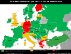 Au premier trimestre 2016, les ventes de PGC en Europe ont progressé de +0.8% en volume, la hausse des prix atteignant +0,7%, la plus faible progression constatée depuis le 1er trimestre 2010. En conséquence, le chiffre d’affaires en sorties caisses a de son côté progressé de +1,5% – le chiffre le plus bas depuis presque 3 ans (+1,2% au 2ème trimestre 2013).