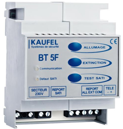 Télécommande BT5F, « la » télécommande idéale pour les tableautiers La télécommande universelle BT5F est compatible avec la majorité des BAES KAUFEL du marché et est dotée d’un voyant LED qui devient rouge lorsqu’un BAES est en défaut de fonctionnement. Elle apporte de nouvelles perspectives d’utilisation notamment grâce à sa compatibilité « allumage / extinction » avec la plupart des blocs du marché (Autotestable SATI). Elle est idéale pour les installations de BRIO+ et BRIO ECO3.